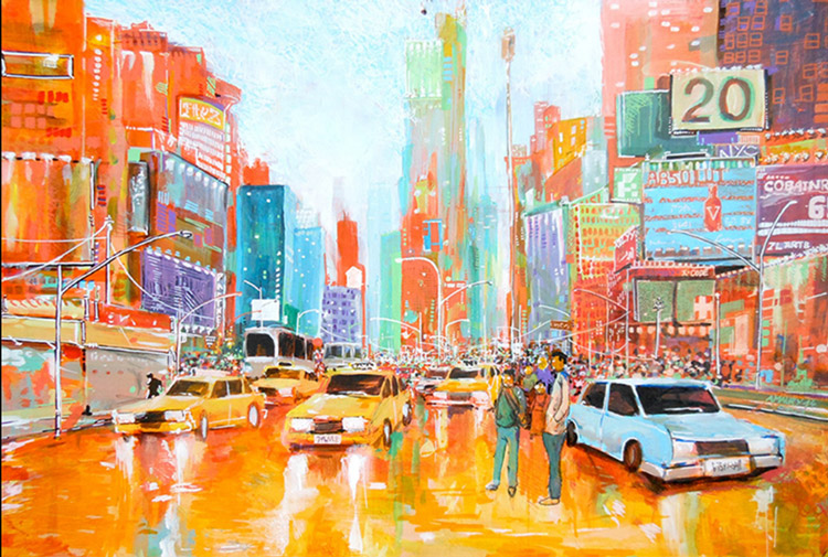 Représentation expressionniste du quartier de Timesquare de New-York City. Utilisation de peinture acrylique et markers Posca. Expressionist representation of the Timesquare district of New York City. Use of acrylic paint and Posca markers. Representación expresionista del distrito Timesquare de la ciudad de Nueva York. Uso de pintura acrílica y rotuladores Posca.